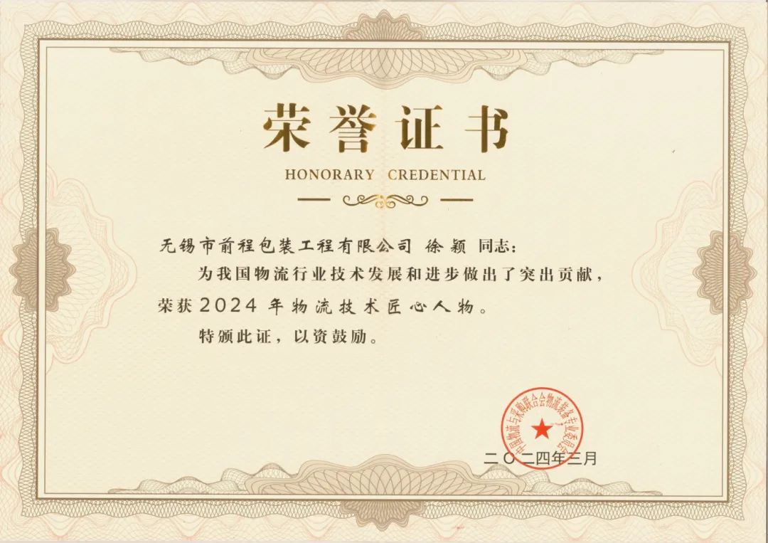 近年來,徐穎總經理帶領技術研發團隊組建了江蘇省綠色智能包裝工程技術研究中心,并成功通過省級工程技術研究中心認定,對我國綠色智能包裝技術及企業創新發展注入新動力。通過開發新的代木材料,幫助客戶努力降低包裝成本,為客戶創造價值,為減少林業資源消耗及其他包裝原材料行業的可持續發展作出了積極的努力;通過推進循環包裝及減量化,為新能源、成套裝備、高端醫療器械等新興產業助力。公司獲得“創新示范領軍企業”、江蘇省“專精特新”企業等多項榮譽稱號,也收獲了眾多客戶的認可和信任。此次,徐穎總經理榮獲”物流技術匠心獎”亦是行業對前程公司不斷創新、穩健發展的高度肯定。